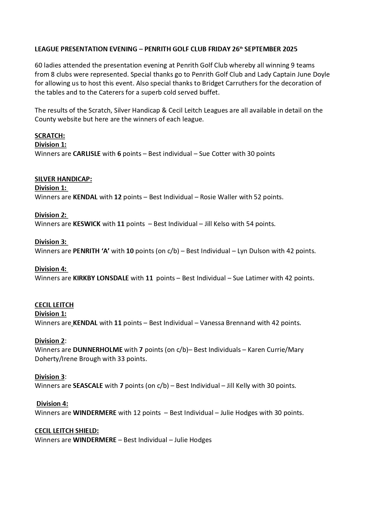 About 80 ladies gathered for the annual League Presentation Evening held at Penrith GC on Friday evening 26th September.